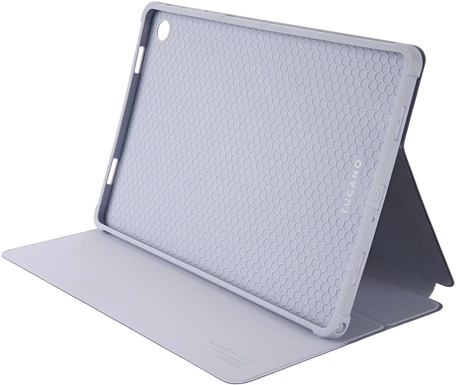 Samsung Galaxy Tab Hülle aus PU in Nylonoptik, hergestellt aus recyceltem Kunststoff. Die Innenseite besteht aus weichem, kratzfestem Material, und die Rückseite mit Kameraausschnitt ist aus weichem, schützendem TPU gefertigt. Die Vorderseite lässt sich in einen praktischen Ständer zum Schreiben und Lesen verwandeln. An der Außenseite befindet sich ein integrierter Ladeschlitz für den S Pen. Diese Hülle wurde aus drei 500-ml-Plastikflaschen hergestellt.